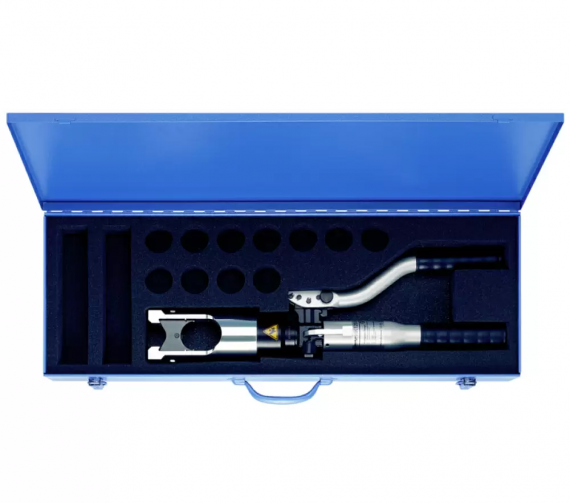 Ручной гидравлический пресс находится в стальном кейсе, предназначенном для хранения и перемещения инструмента с 11 секциями для сменных матриц (арт.klkMK120U). Громадный интервал сечений - до 400 мм2. Уменьшение операций опрессовки до 60% сравнительно с 6-тонными инструментами. Гидравлическое биоразлагающееся масло, используемое для пресса, не наносит вред экологии.