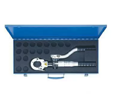Ручной гидравлический пресс находится в стальном кейсе, предназначенном для хранения и перемещения инструмента с 17 секциями для сменных матриц (арт.klkMK6022). Большой интервал сечений - до 300 мм2. Гидравлическое биоразлагающееся масло, используемое для пресса, не наносит вред экологии.