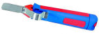 Дополнительная функция этой модели это встроенное крючкообразное лезвие, которое погружается в корпус инструмента. Лезвие может быть зафиксировано в обоих положениях, что значительно снижает риск повреждений, которые могут возникнуть у кабельных ножей с лезвием в постояно зафиксированном наружном положении. Кабельный нож оснащен эргономичной противоскользящей формой ручки. При помощи регулирующего винта в конце инструмента производится плавное бесступенчатое выставление глубины реза, что предотвращает повреждение изоляции жил проводов. Внутри инструмента вращающееся лезвие-эксцентрик автоматически поворачивается для поперечного и продольного реза.